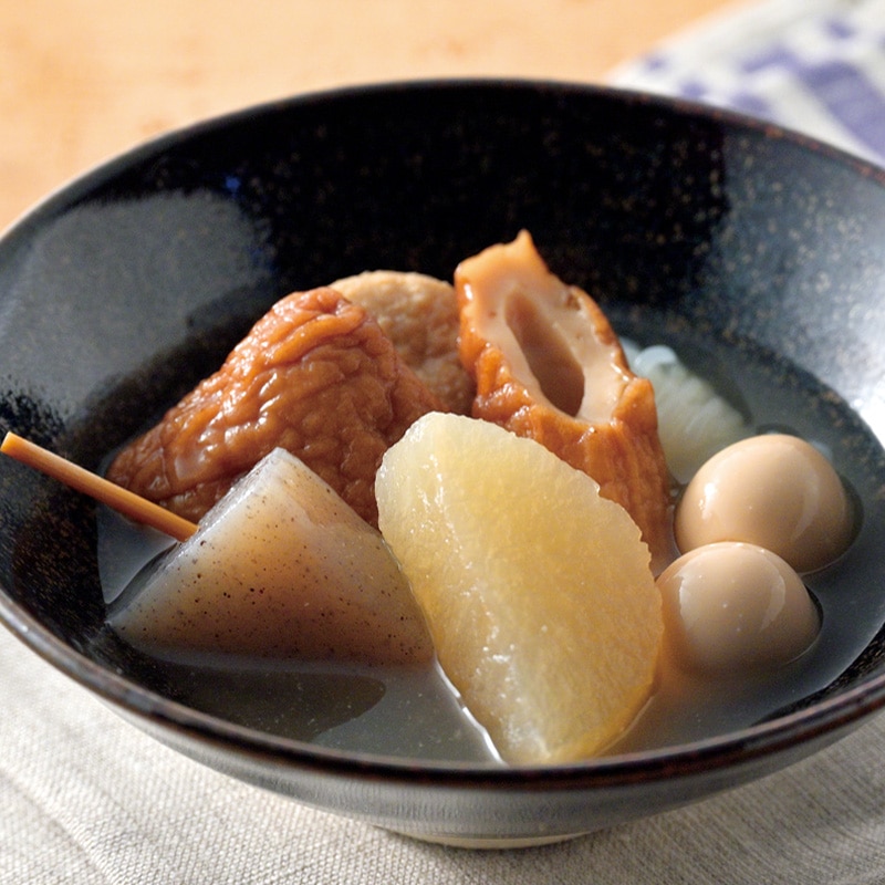 | 原材料名 | こんにゃく(国内製造、中国製造)、大根、うずら卵、調味液[たん白加水分解物、だし抽出液(かつお削りぶし、焼きあご、昆布)、砂糖、還元水あめ、食塩、酵母エキス]、ちくわ、さつまあげ、がんもどき、食塩/ソルビトール、調味料(アミノ酸等)、加エデンプン、乳化剤、水酸化Ca、(一部に小麦・卵・ごま・大豆・やまいもを含む) |